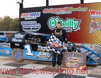 A quartet of Trailer Express IMCA Sport Mods battle it out, 10f Mitchell Fairbank, 10b Grant Besaw, 22s Jared Spauling, 72l JJ Vanderloop