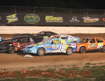 A quartet of Trailer Express IMCA Sport Mods battle it out, 10f Mitchell Fairbank, 10b Grant Besaw, 22s Jared Spauling, 72l JJ Vanderloop