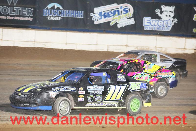 A quartet of Trailer Express IMCA Sport Mods battle it out, 10f Mitchell Fairbank, 10b Grant Besaw, 22s Jared Spauling, 72l JJ Vanderloop