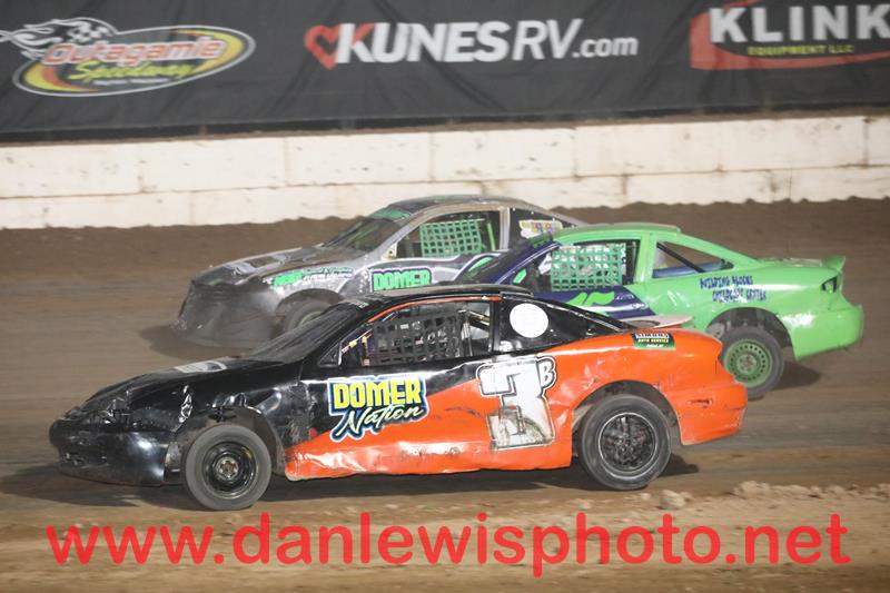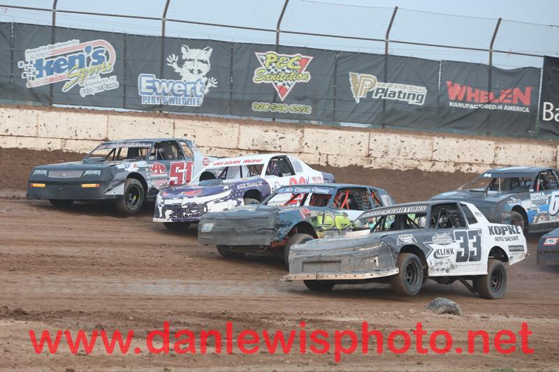 A quartet of Trailer Express IMCA Sport Mods battle it out, 10f Mitchell Fairbank, 10b Grant Besaw, 22s Jared Spauling, 72l JJ Vanderloop