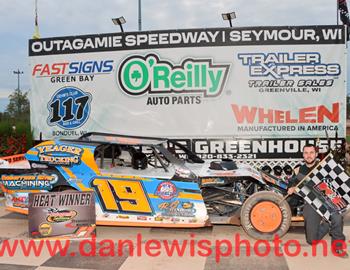 A quartet of Trailer Express IMCA Sport Mods battle it out, 10f Mitchell Fairbank, 10b Grant Besaw, 22s Jared Spauling, 72l JJ Vanderloop