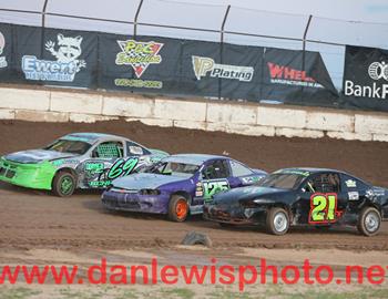 A quartet of Trailer Express IMCA Sport Mods battle it out, 10f Mitchell Fairbank, 10b Grant Besaw, 22s Jared Spauling, 72l JJ Vanderloop