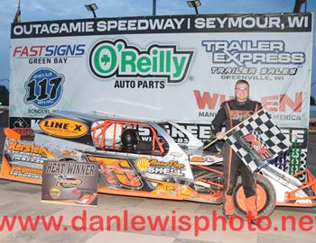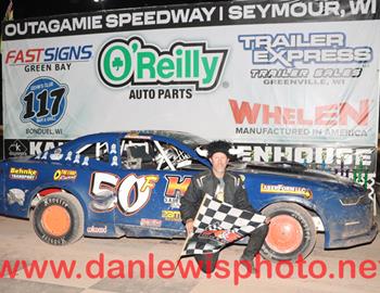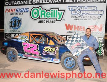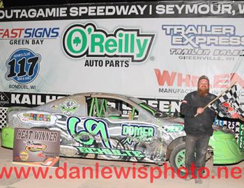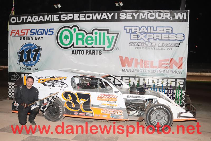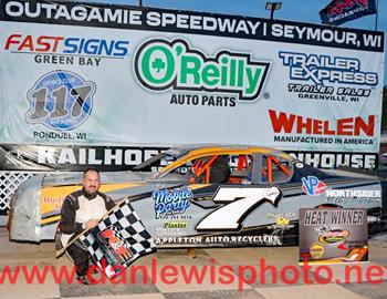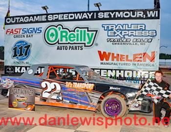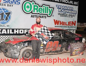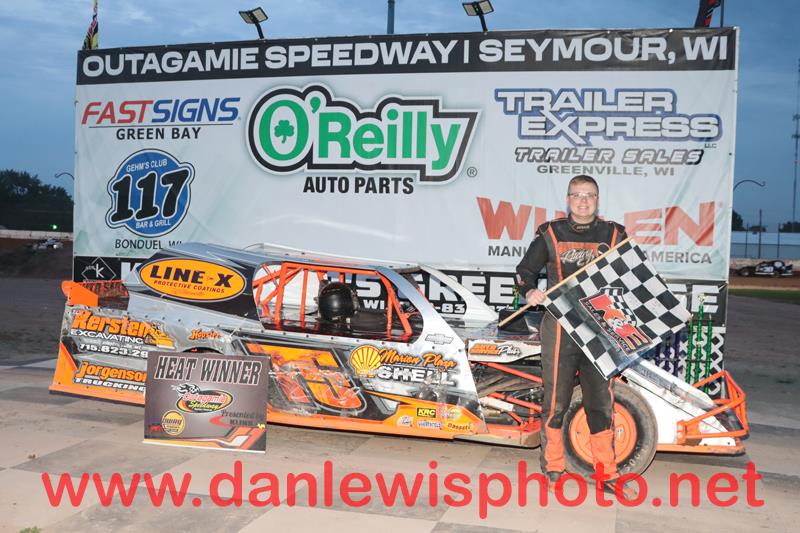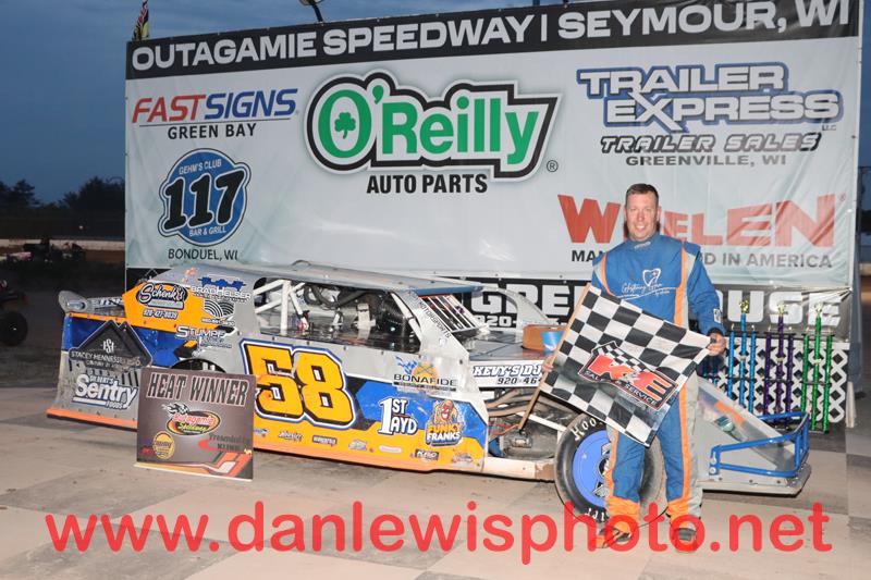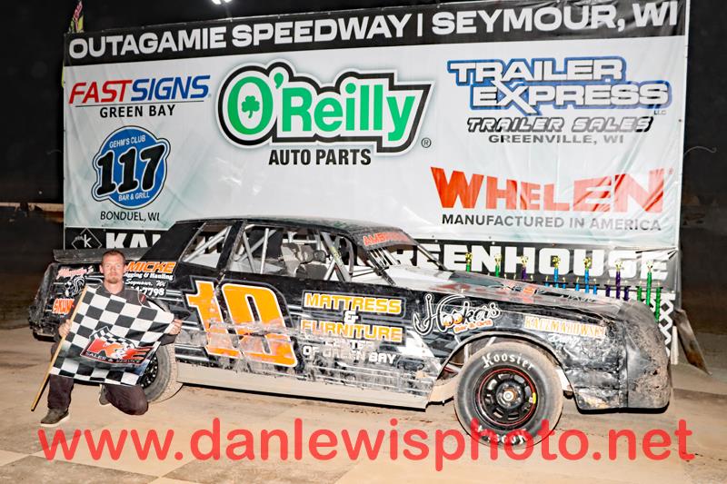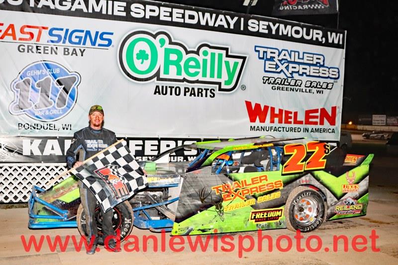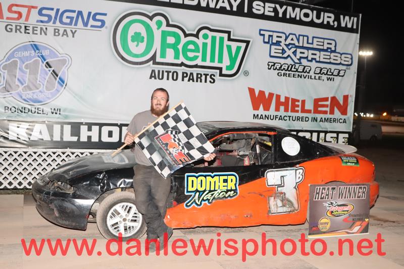 A quartet of Trailer Express IMCA Sport Mods battle it out, 10f Mitchell Fairbank, 10b Grant Besaw, 22s Jared Spauling, 72l JJ Vanderloop