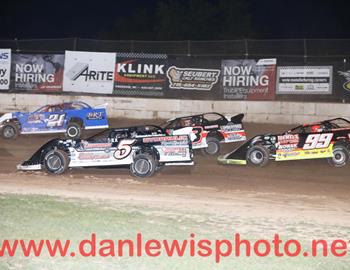15 Nick Anvelink, 10 Paul Parker and 74 Mitch McGrath running each other hard in Seubert Calf Ranches Late Model Action.
