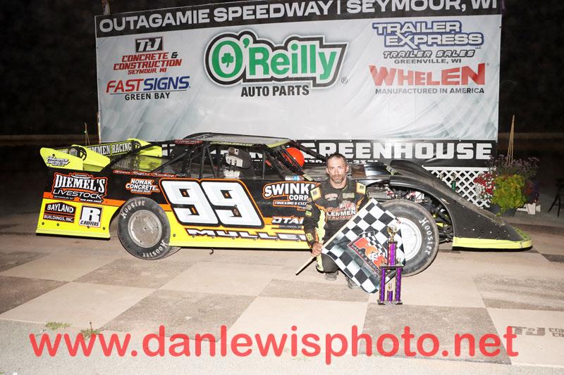 (Seymour, Wisconsin) July 19 – Hometown driver Mike Mullen led wire-to-wire en route to winning the late model feature at Outagamie Speedway in Seymour Friday.